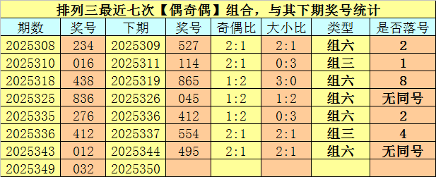 奇偶分析:排列三上期奖号为032,其奇偶类型为【偶奇偶】,最近七次出现奇偶类型偶奇偶的号码分别为:234、016、438、836、276、412、012,其下期奖号分别为:234、016、438、836、276、412、012。其中号码奇偶比为11:10,奇偶号码开出频次基本相当,本期注意偶数号码转热,重点关注全偶组合出现。