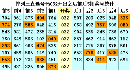 四、排列三直选号码032历史上开出8次,其前后五期奖号分别为: