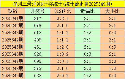 二、体彩排列三前9期奖号开出:817-079-012-495-431-826-695-373-032,其中奖号大小比为12:15,012路比为12:8:7,奇偶比为15:12;