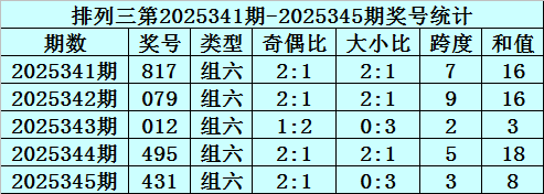奇偶分析:最近5期奇偶个数比开出8:7,其中全奇组合开出1次,目前遗漏2期;两奇一偶组合开出2次,目前遗漏0期;两偶一奇组合开出1次,目前遗漏1期;全偶组合开出1次,目前遗漏4期。本期预计开出两奇一偶组合。