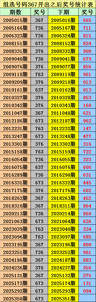 排列三组选367出现之后下期分别开出:665、711、815、824、900、679、856、961、013、013、853、168、621、962、147、477、316、722、323、606、631、445、602、452、864、860、626、334、685、800、961、883、356、275、131、094。