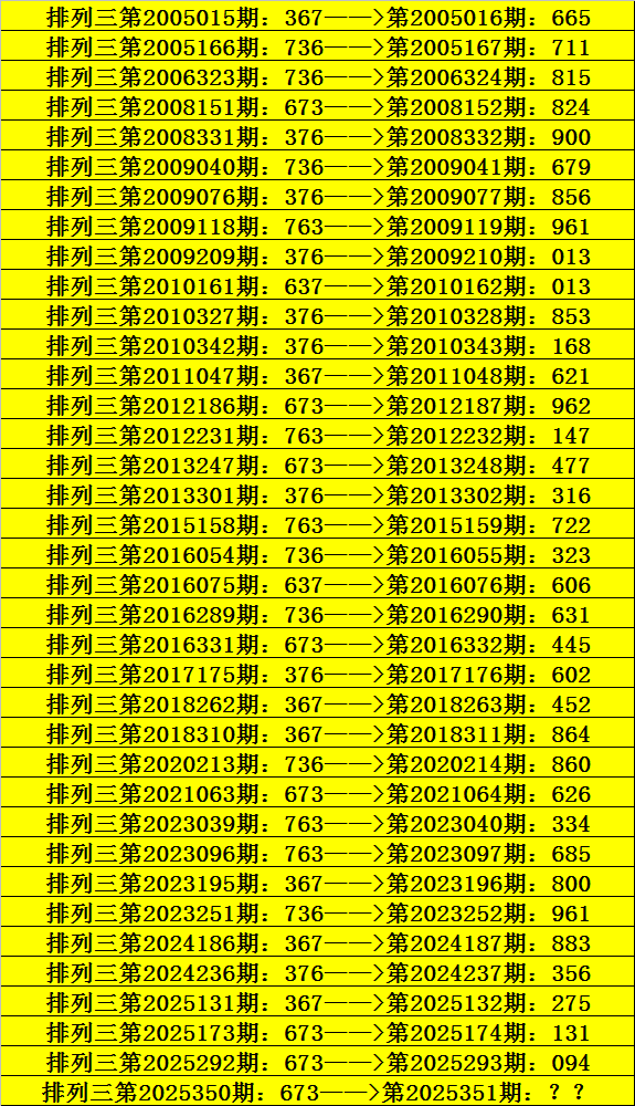 第2025350期排列三奖号为673,历史上该号码组选开出37次,下期奖号分别为:665、711、815、824、900、679、856、961、013、013、853、168、621、962、147、477、316、722、323、606、631、445、602、452、864、860、626、334、685、800、961、883、356、275、131、094。
