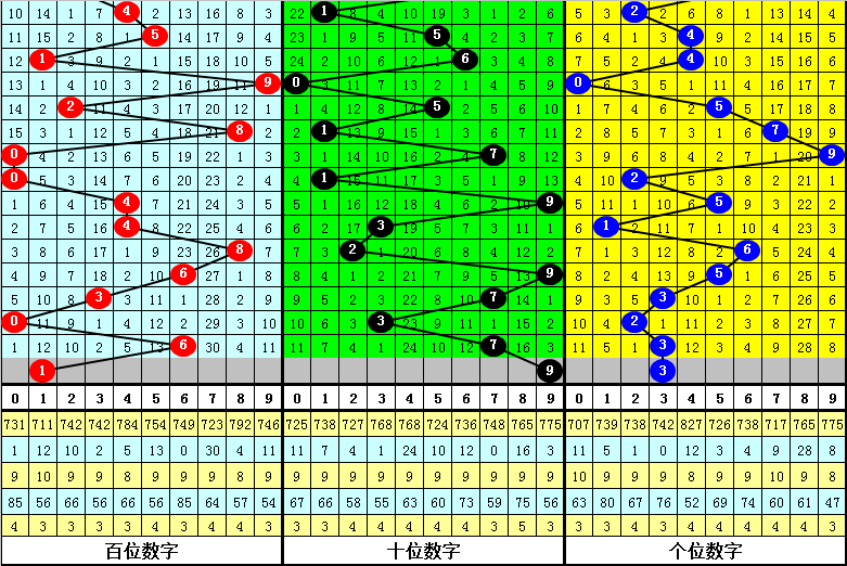 百位:当前遗漏最大的号码为7,遗漏30期,历史上该号最大遗漏为64期,本期百位继续排除号码7。