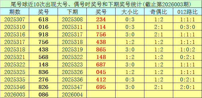 在尾号球前10次开出大号、偶号类型之后,其下期分别开出奖号:234、114、756、438、865、148、687、045、412、695,其中号码奇偶比为4:6,大小比为7:3,012路比为1:3:6。