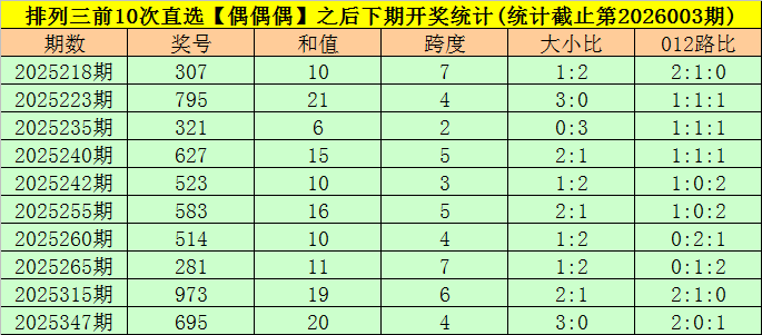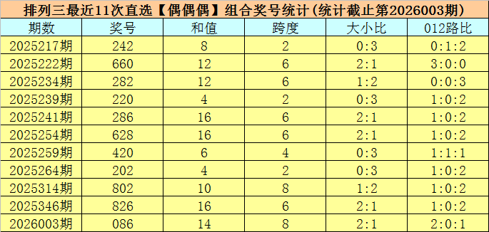 开奖回顾:排列三第2026003期开出奖号:086,类型为组六,和值为14,奇偶比为0:3,大小比为2:1,跨度为8。