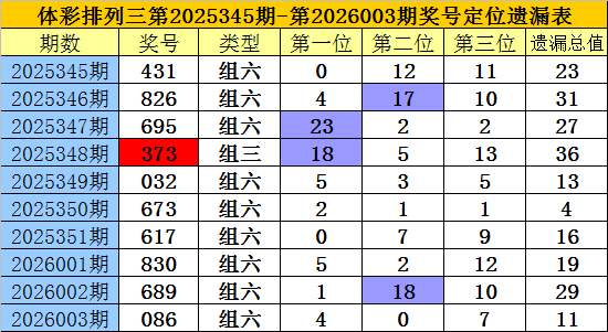 开奖回顾:排列三第2026003期奖号为:086,各位号码遗漏值分别为4、0、7,遗漏总值为11。