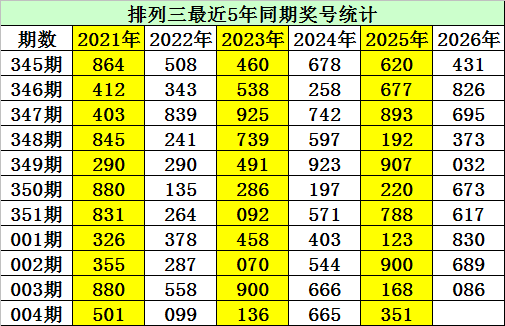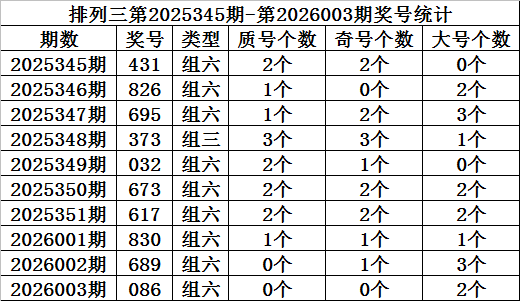 上期回顾:排列三第2026003期开奖:086,质合比为0:3,奇偶比为2:1,大小比为0:3。