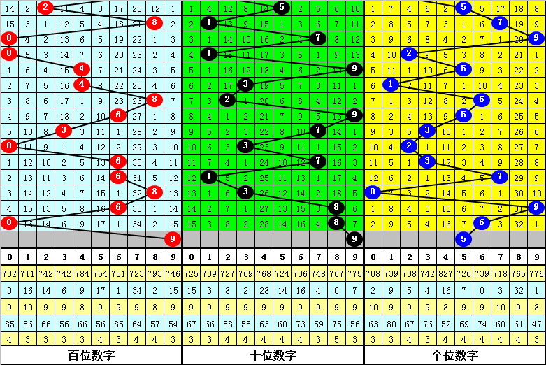 十位:上期为8,近10期012路比为4:3:3,其中2路号连出2期,本期排除2路号,关注0路号,参考9。