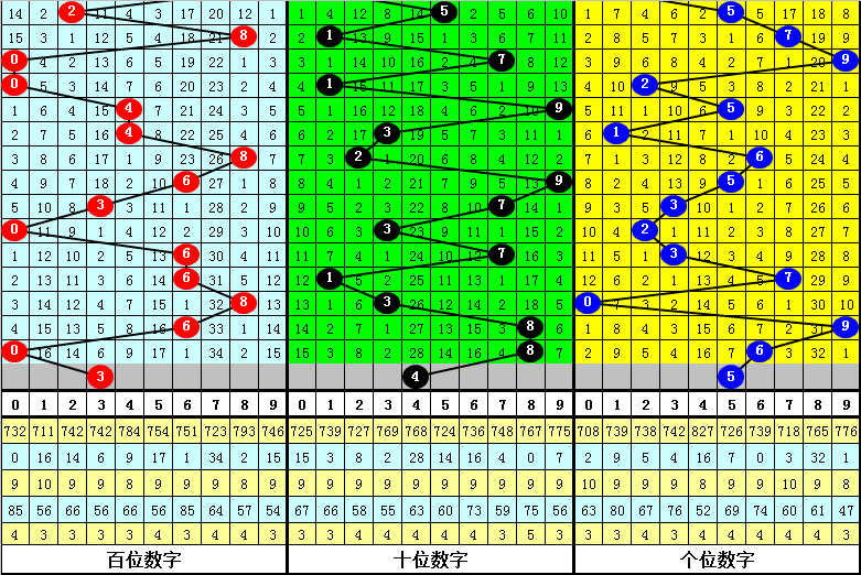 百位:大小比为4:4,奇偶比为3:5,本期参考号码3。