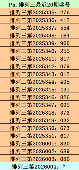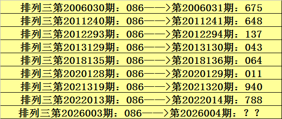 第2026003期排列三奖号为086,历史上该号码直选出现9次,下期奖号分别为:675、648、137、043、064、011、940、788。