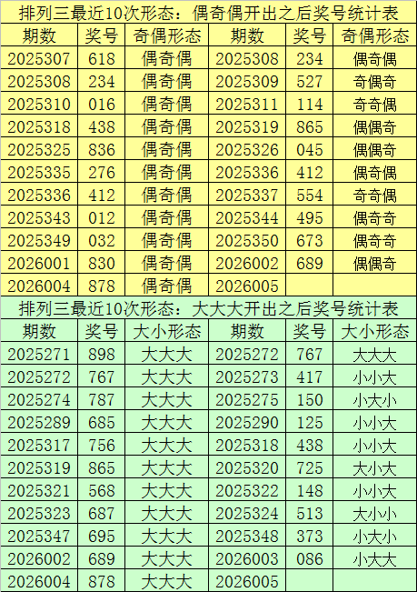 排列三最近10次同时开出奇偶形态:偶奇偶和大小形态:大大大时其奖号分别为:676-658-696-898-678-656-656-696-856-898-878,下期分别开出号码为:129-191-297-037-914-362-990-267-321-767,详细统计见下表:
