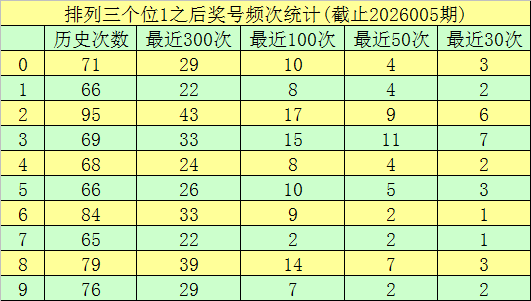 第三位杀号:第三位上期出现奖号1,该位历史上奖号1已开出了740次,最近100次第三位开出1时,下期号码0-9分别落号:号码2→17次,3→15次,8→14次,0、5→10次,6→9次,1、4→8次,9→7次,7→2次。