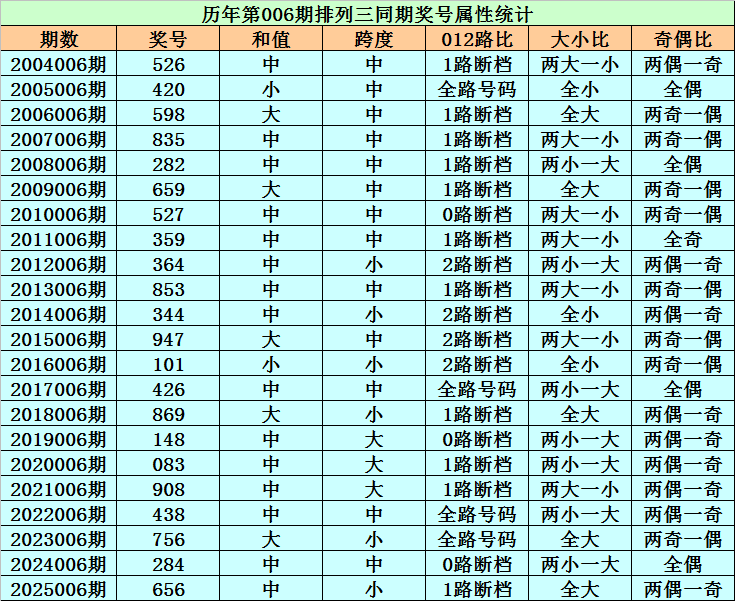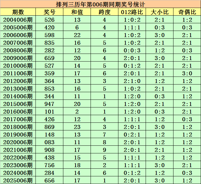 历史上第2026006期排列三已开出22期奖号了,历年同期奖号分别为:526、420、598、835、282、659、527、359、364、853、344、947、101、426、869、148、083、908、438、756、284、656,详细统计见下表: