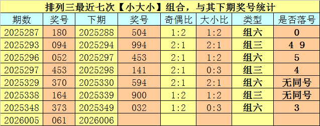大小分析:排列三上期开出号码061,大小类型为【小大小】,最近七次开出大小类型小大小的奖号分别为:180、094、052、453、370、164、373,其下期分别开出号码:504、994、453、141、594、900、032。其中号码大小比为7:14,大号开出比例较低,本期适当关注大号回补,预计开出2个大号。
