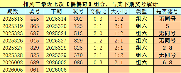 开奖回顾:排列三第2026005期开奖号码为:061。奖号类型为:组六,大小类型为:小大小,奇偶类型为:偶偶奇,无重号。