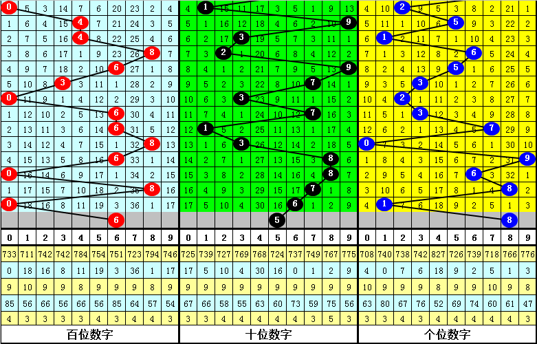 0路号码上期开出2个,近10期共出现17个表现相对活跃,其中0开出4个、3开出5个、6开出6个、9开出2个,本期应注意0路号码回补,参考号码6。