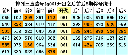 四、排列三直选号码061历史上开出6次,其前后五期奖号分别为: