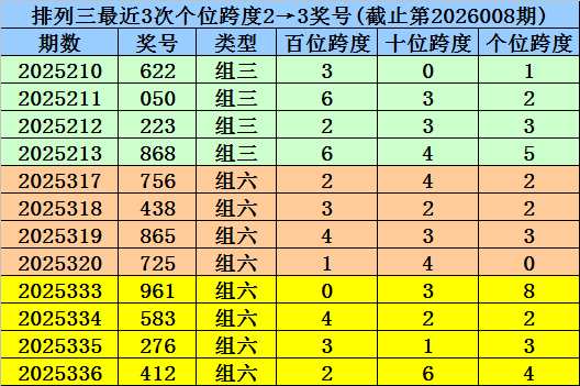 第2025333-第2025335期奖号:961、583、276,其下期奖号为:412,末位号码跨度为2;