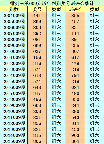 在历年同期中两码合开出年限分别为:4出现11年,1、3出现7年,2、8、9出现6年,0、5、7出现5年,6出现3年,第2026009期预计两码合出现:3、4、9。