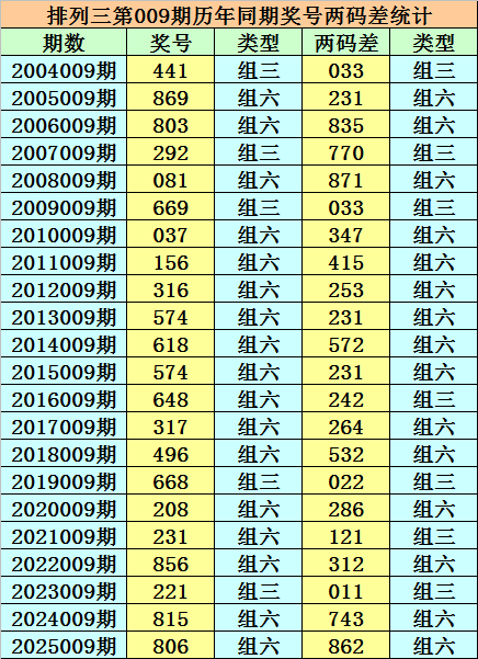 在历年开奖中,两码差开出年限分别为:2出现13年,3出现11年,1出现8年,0、4、5、7出现5年,8出现4年,6出现3年,9出现0年,第2026009期预计两码差出现:1、4、5。