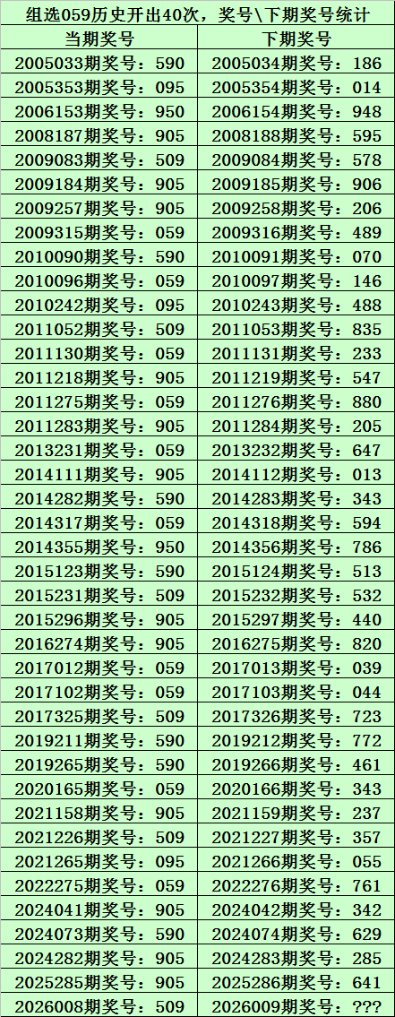 二、组选059分析:排列三历史上已开出40次组选号码059了,其奖号和下期开出奖号统计如下: