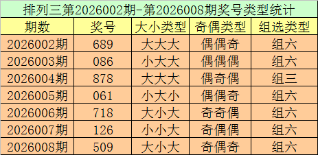 排列三第2026008期回顾:奖号509,奇偶比2:1,大小比2:1,和值14,类型:组六。