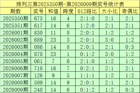 开奖回顾:排列三第2026009期奖号开出:248,组选类型:组六,大小比为1:2,奇偶比为0:3,和值为14,跨度为6。
