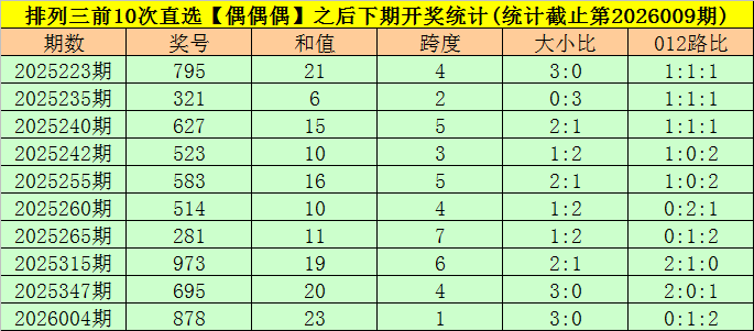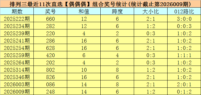 开奖回顾:排列三第2026009期开出奖号:248,类型为组六,和值为14,奇偶比为0:3,大小比为1:2,跨度为6。