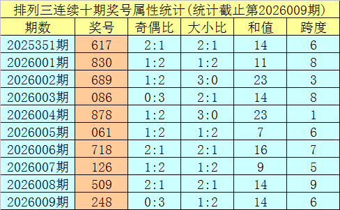 上期回顾:排列三第2026009期奖号:248。类型:组六,奇偶形态:偶偶偶,大小形态:小小大,和值:14,跨度:6。