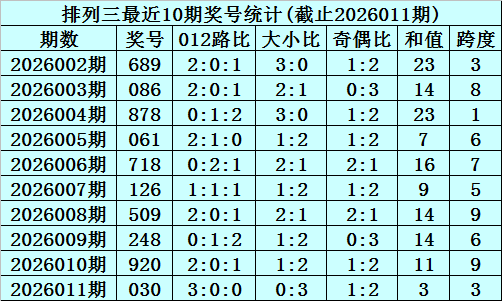 上期回顾:排列三2026011期奖号为030,奇偶比为1:2,大小比为0:3,跨度为3。