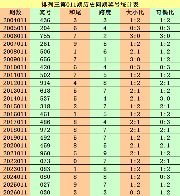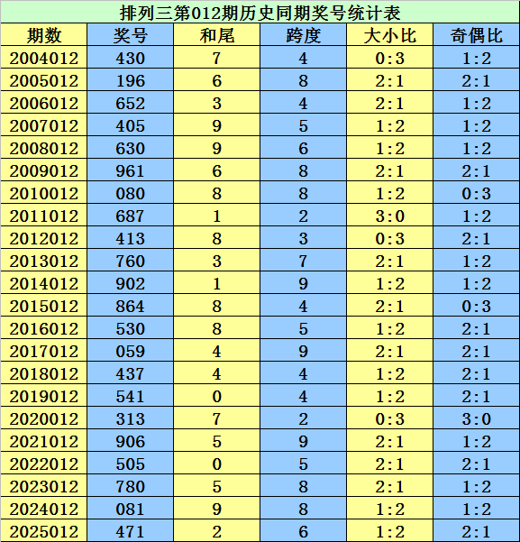 从2004年至今排列三已开出7486期奖号了,本期为排列三2026年第012期开奖,历史同期已出现22次奖号: