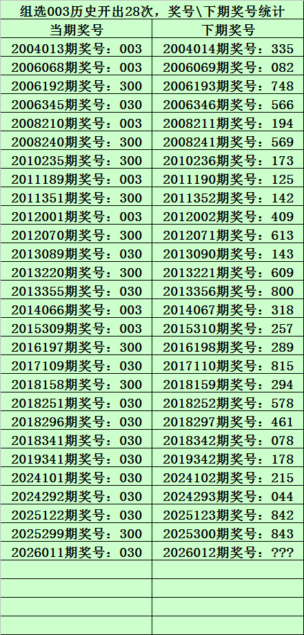 上期回顾:排列三第2026011期奖号为:030,类型:组三,历史上直选号码030出现了12次,组选号码003出现了28次。