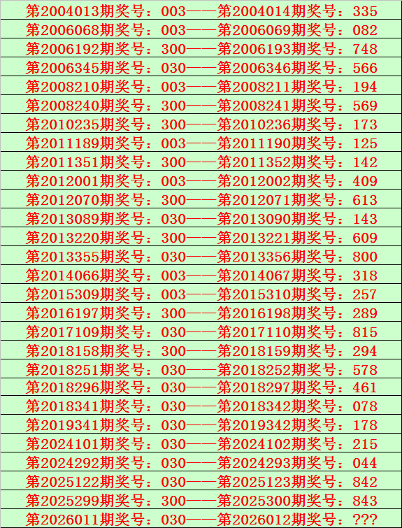 排列三第2026012期开奖日期:2026年1月12日,历史上第012期已开出了22次奖号,历年同期号码分别为:430、196、652、405、630、961、080、687、413、760、902、864、530、059、437、541、313、906、505、780、081、471。