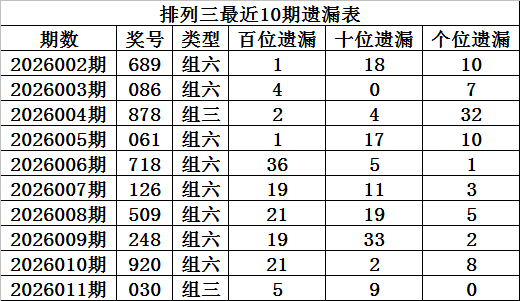 上期回顾:排列三第2026011期奖号:030,组三,直选遗漏总值为14期。