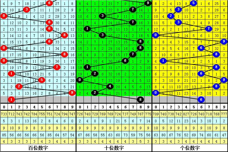 大中小分析:在组选0-9号码分布图中,前10期小 号(0-2区段)出现11枚奖号,中号(3-6区段)出现7枚奖号,大号(7-9区段)出现12枚奖号,上期中号区域没有落号,本期预计大中小区域各出1枚奖号。