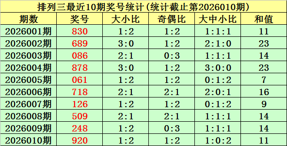 上期回顾:排列三第2026010期奖号为:920。奖号类型:组六,和值:11,奇偶比:1:2,跨度:9,大小比:1:2。
