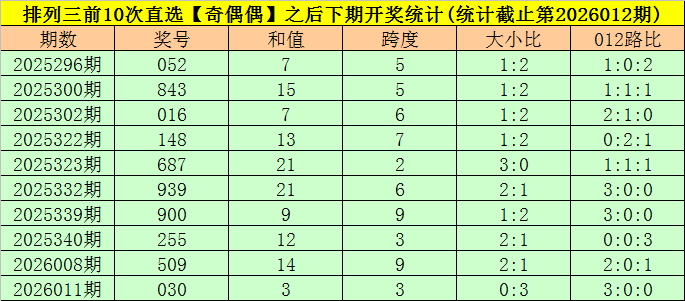 排列三上期奖号为522,开出奇偶类型为【奇偶偶】,前10次【奇偶偶】类型奖号分别开出:124、300、582、568、148、980、164、900、126、920;