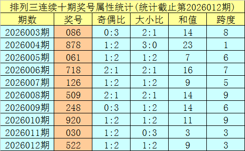 上期回顾:排列三第2026012期奖号:522。类型:组三,奇偶形态:奇偶偶,大小形态:大小小,和值:9,跨度:3。