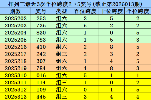 末位跨度分析:前3期末位奖号为0-2-7,最近两期末位奖号跨度为2、5,末位奖号跨度历史上连续两期开出2、5的现象共126次,其最近两次奖号为: