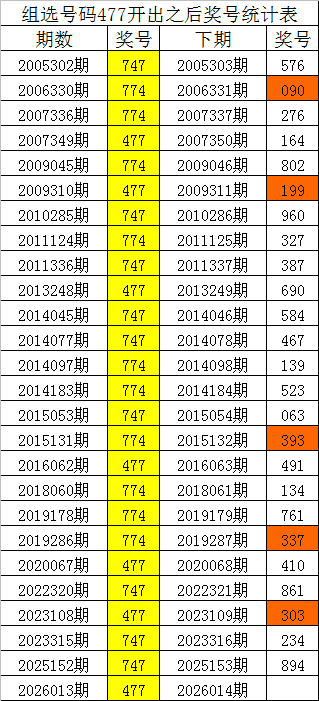 从上表统计可以看出,直选号码477开出之后,其下期奖号: