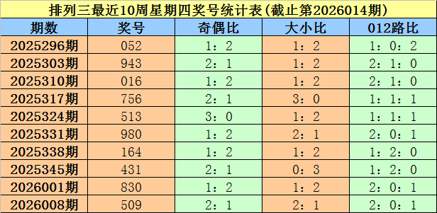 上期回顾:排列三第2026014期奖号为833。其中奖号奇偶比为2:1,大小比为1:2,012路比为2:0:1。