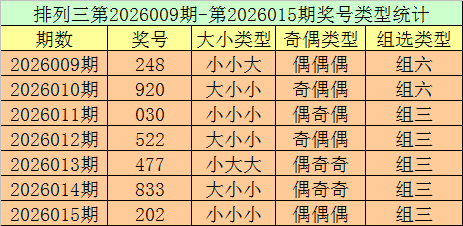 排列三第2026015期回顾:奖号202,奇偶比0:3,大小比0:3,和值4,类型:组三。