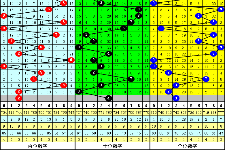 百位走势:近10期在0-9之间出号,跨度为10点,出号比较分散,上期奖号为2,下降6点,本期注意该位重复出现。另外近10期该位大小比为5:5,持平,本期预计出现小 号,关注号码2。