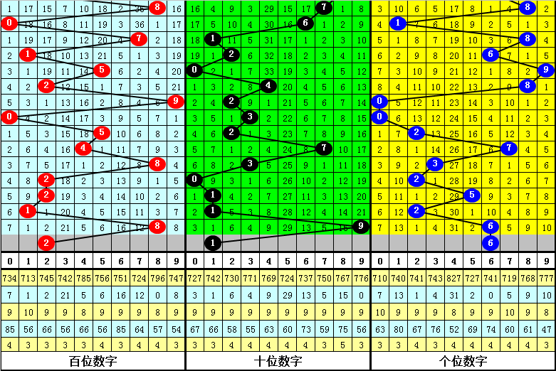 从以上统计可以看出,百十位两码合差7与1同时出现之后其下期两码合差表现最热的4个分别为:0134,本期百十位两码合差可以参考这四码中的数据。