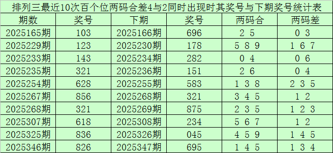 从以上统计可以看出,百个位两码合差4与2同时出现之后其下期两码合差表现最热的4个分别为:1345,本期百个位两码合差可以参考这四码中的数据。
