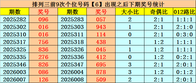 个位号码:上期奖号为大号、偶数、0路号码:6,历史上个位号码6共开出741期,前一次出现在第2026007期,上期遗漏10期再出。
