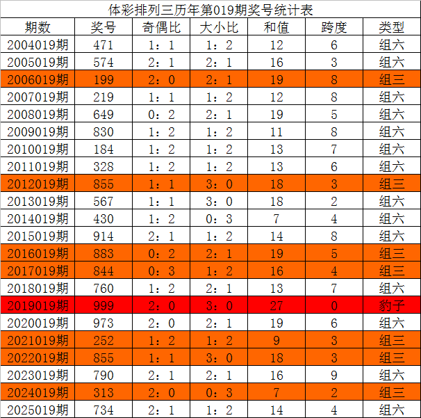 在历年排列三第019期开奖中:次豹子号码出现1次,组三号码出现7次,组六号码出现14次。组六号码出现比例略高,本期奖号形态参考:组六号码。