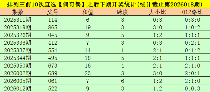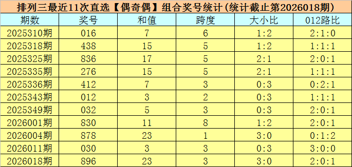 开奖回顾:排列三第2026018期开出奖号:896,类型为组六,和值为23,奇偶比为1:2,大小比为3:0,跨度为3。