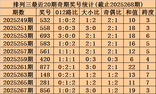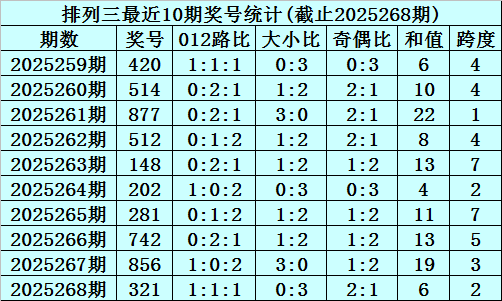 上期回顾:排列三2025268期奖号为321,奇偶比为2:1,大小比为0:3,跨度为6。