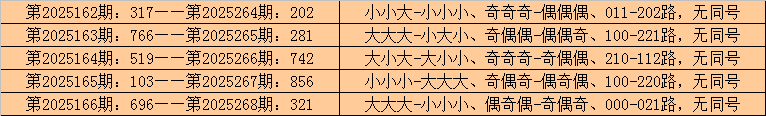 在排列三历史开奖中,第2025162期-第2025166期连续5期奖号为:317-766-519-103-696。